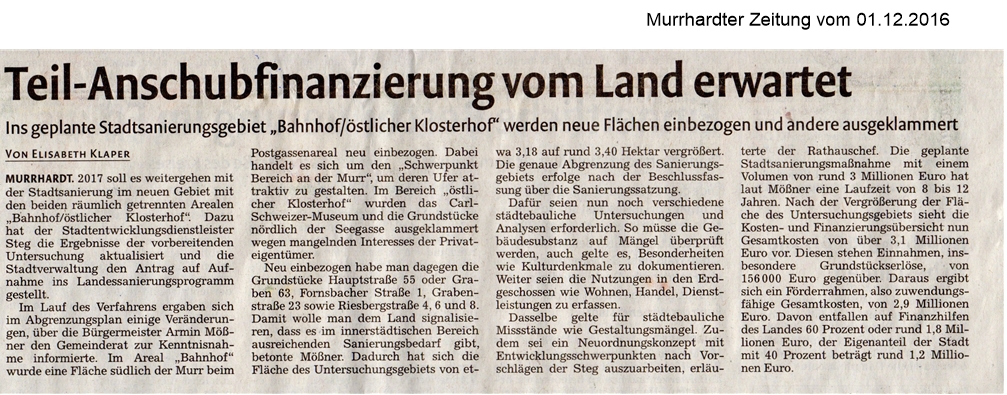 01. Dezember 2016 - Murrhardter Zeitung - Stadt Murrhardt - Teil-Anschubfinanzierung vom Land erwartet