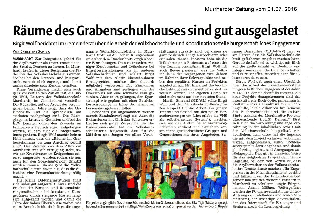 01. Juli 2016 - Murrhardter Zeitung - VHS - Räume des Grabenschulhauses sind gut ausgelastet