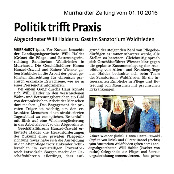 01. Oktober 2016 - Murrhardter Zeitung - Sanatorium Waldfrieden - Politik trifft Praxis