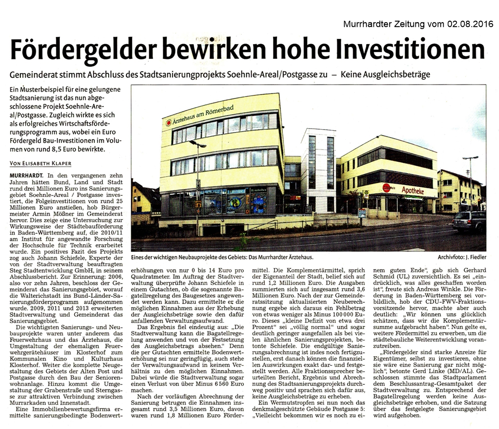 02. August 2016 - Murrhardter Zeitung - Stadt Murrhardt - Fördergelder bewirken hohe Investitionen