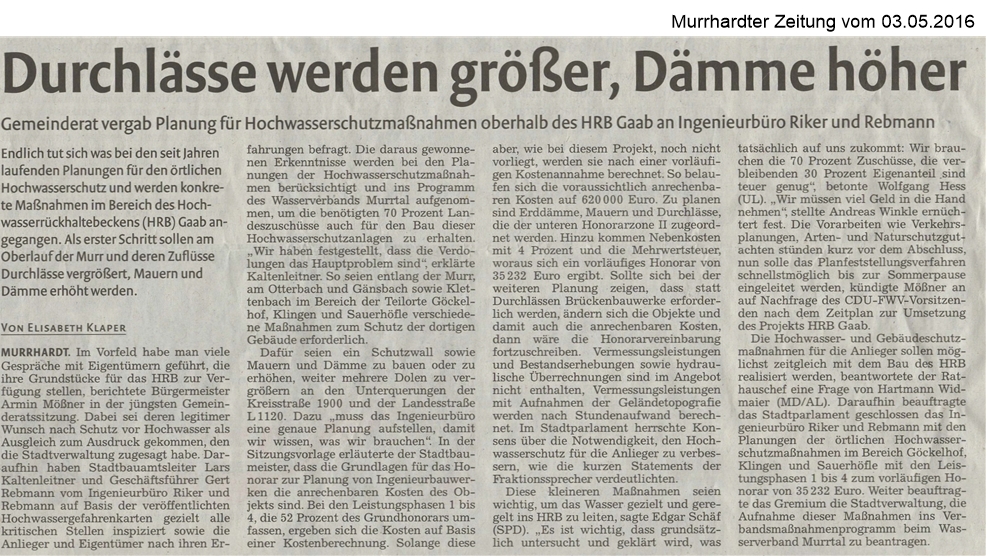 03. Mai 2016 - Murrhardter Zeitung - Riker+Rebmann - Durchlässe werden größer, Dämme höher
