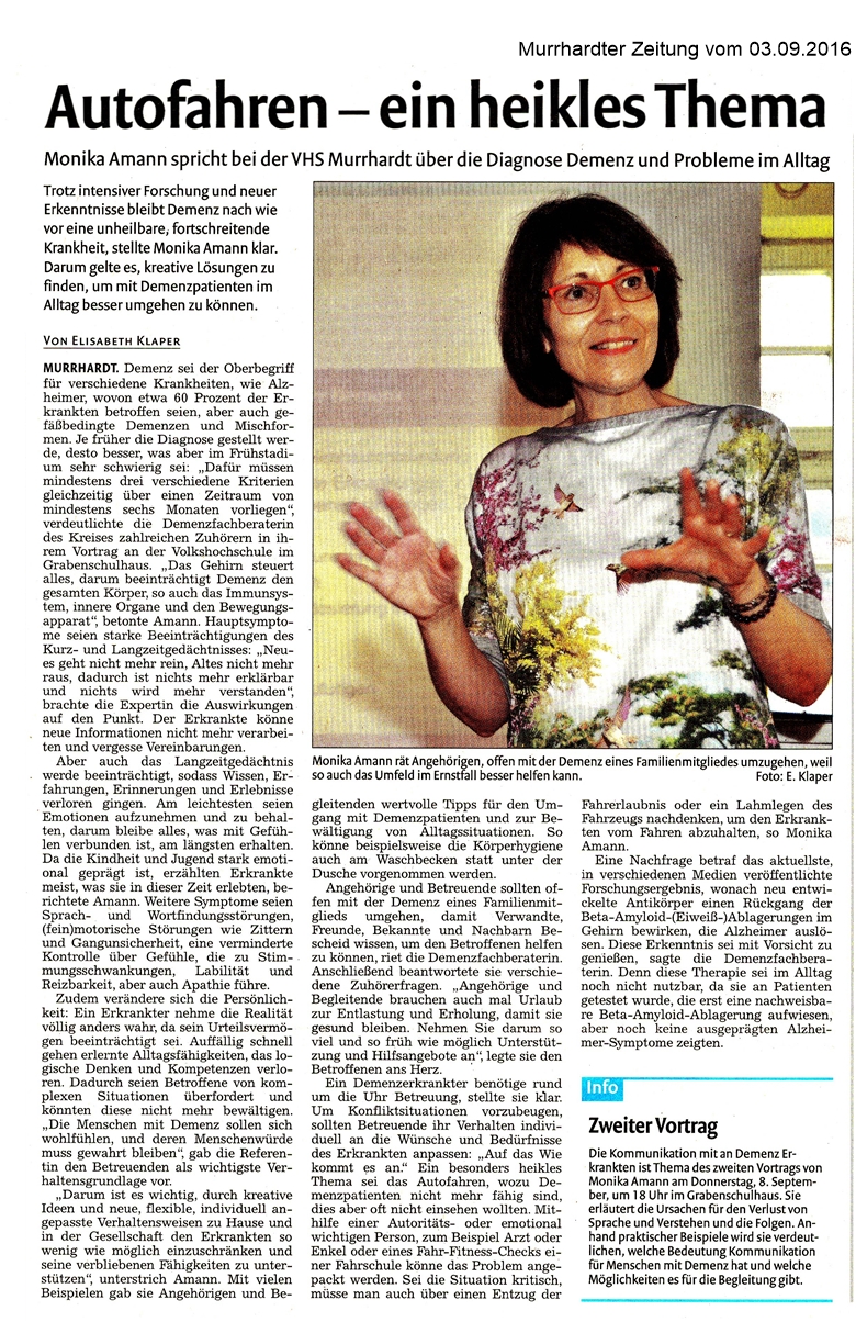 03. September 2016 - Murrhardter Zeitung - VHS - Autofahren - ein heikles Thema