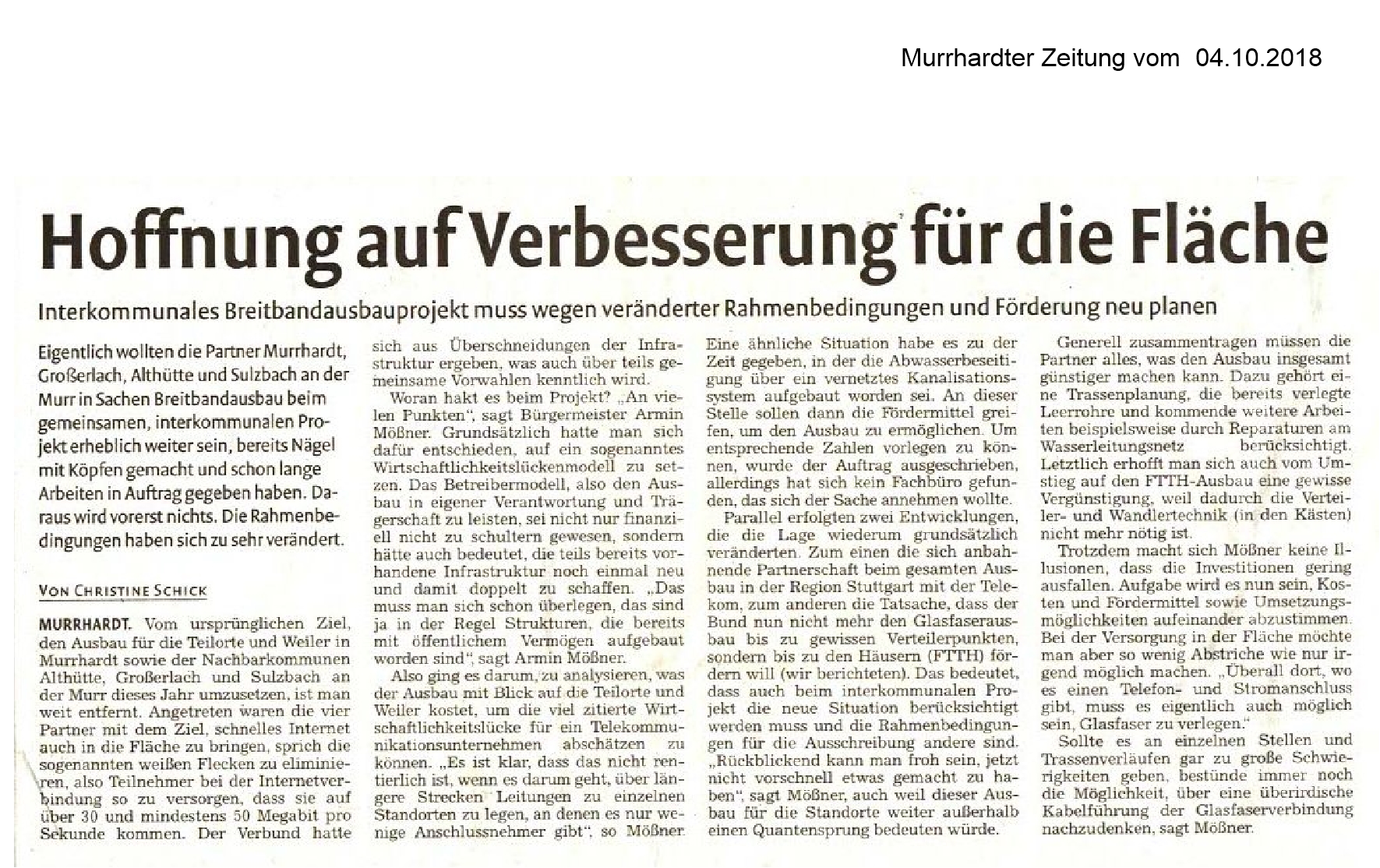 04. Oktober 2018 - Murrhardter Zeitung - Stadt Murrhardt - Hoffnung auf Verbesserung für die Fläche