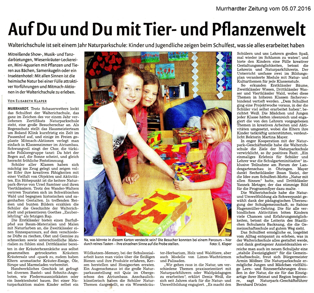 05. Juli 2016 - Murrhardter Zeitung - Walterichschule - Auf Du und Du mit Tier- und Pflanzenwelt