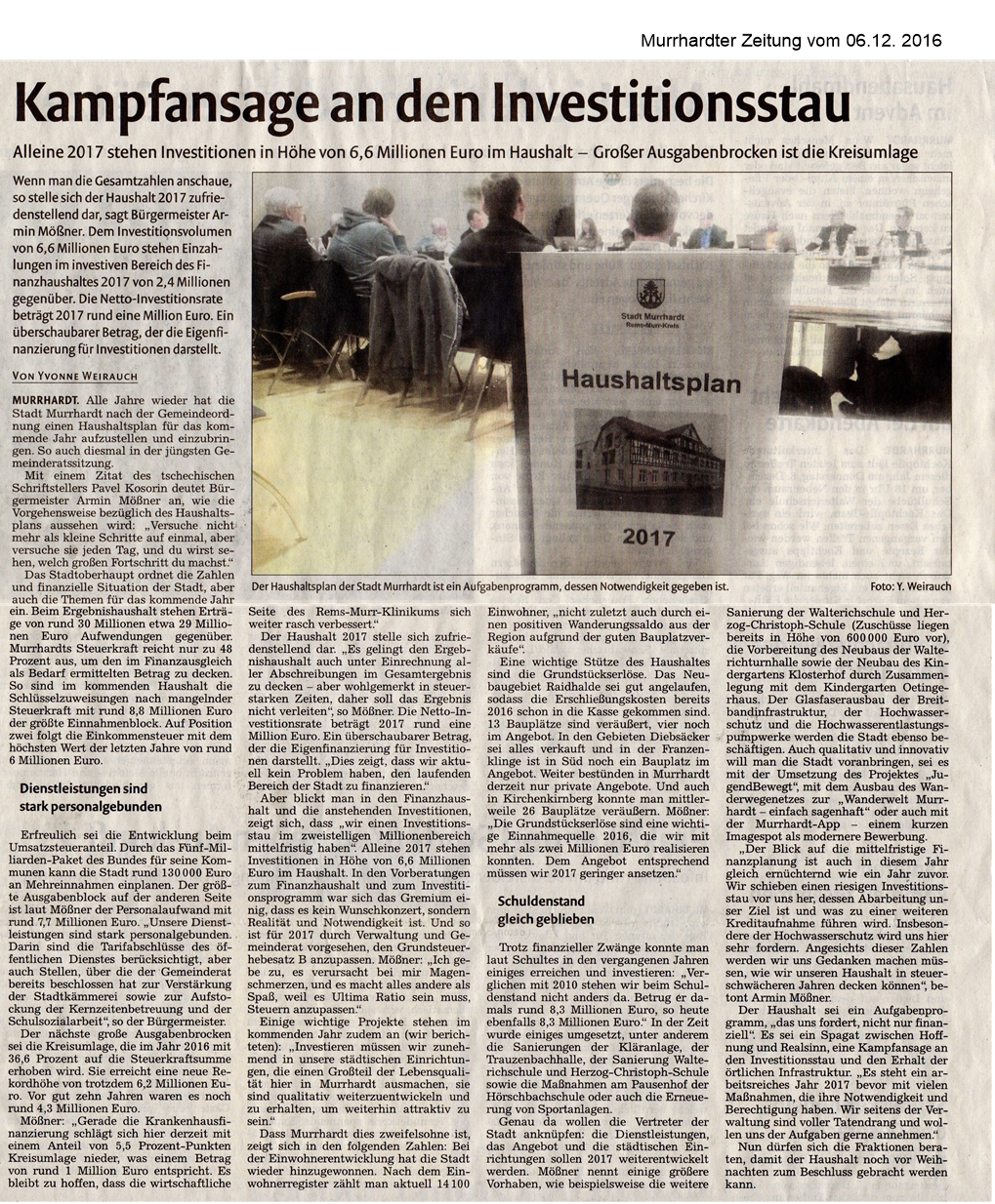 06. Dezember 2016 - Murrhardter Zeitung - Stadt Murrhardt - Kampfansage an den Investitionsstau