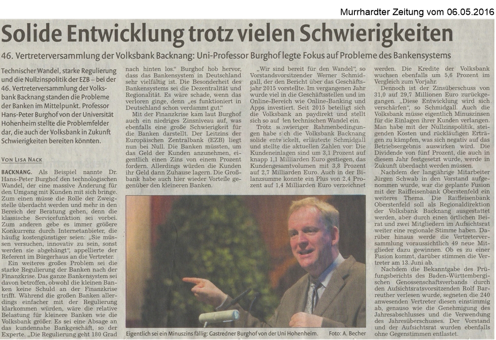 06. Mai 2016 - Murrhardter Zeitung - Volksbank Backnang - Solide Entwicklung trotz vielen Schwierigkeiten