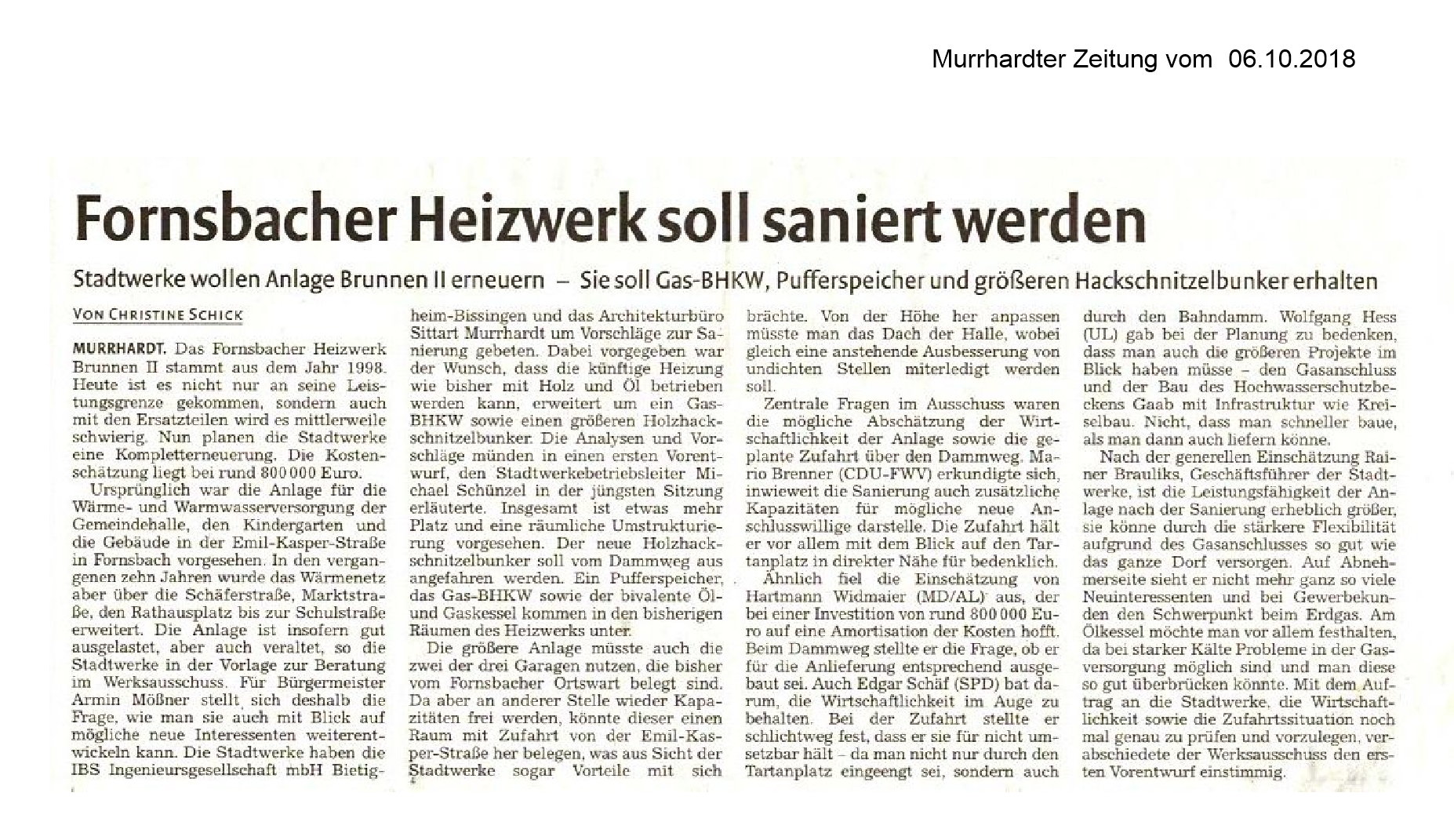 06. Oktober 2018 - Murrhardter Zeitung - Stadt Murrhardt - Stadtwerke - Fornsbacher Heizwerk soll saniert werden