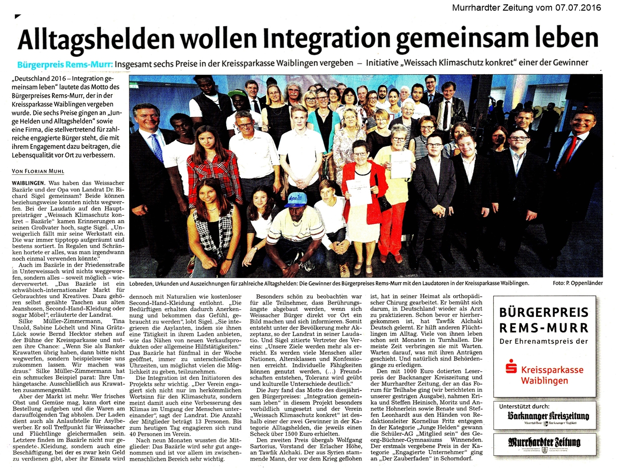 07. Juli 2016 - Murrhardter Zeitung - Kreissparkasse Waiblingen - Alltagshelden wollen Integration gemeinsam leben