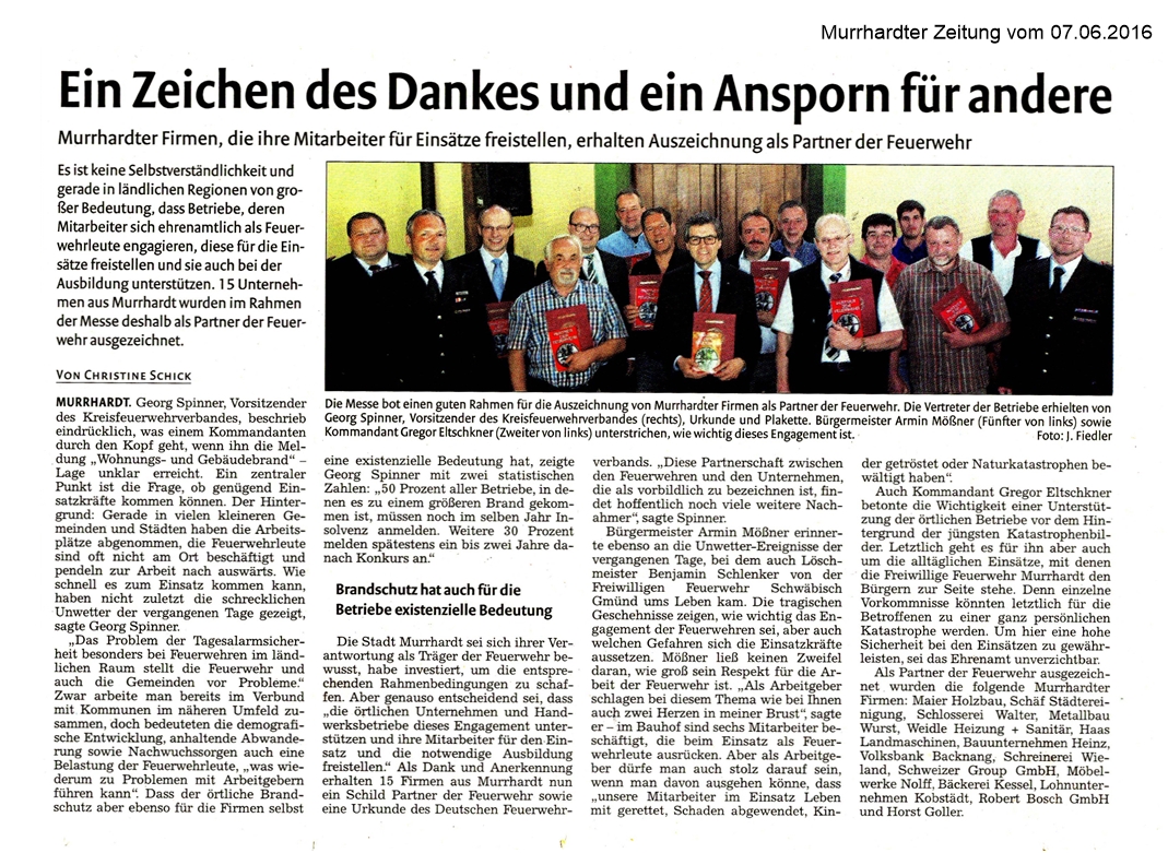 07. Juni 2016 - Murrhardter Zeitung - UFOM Mitglieder - Ein Zeichen des Dankes und ein Ansporn für andere