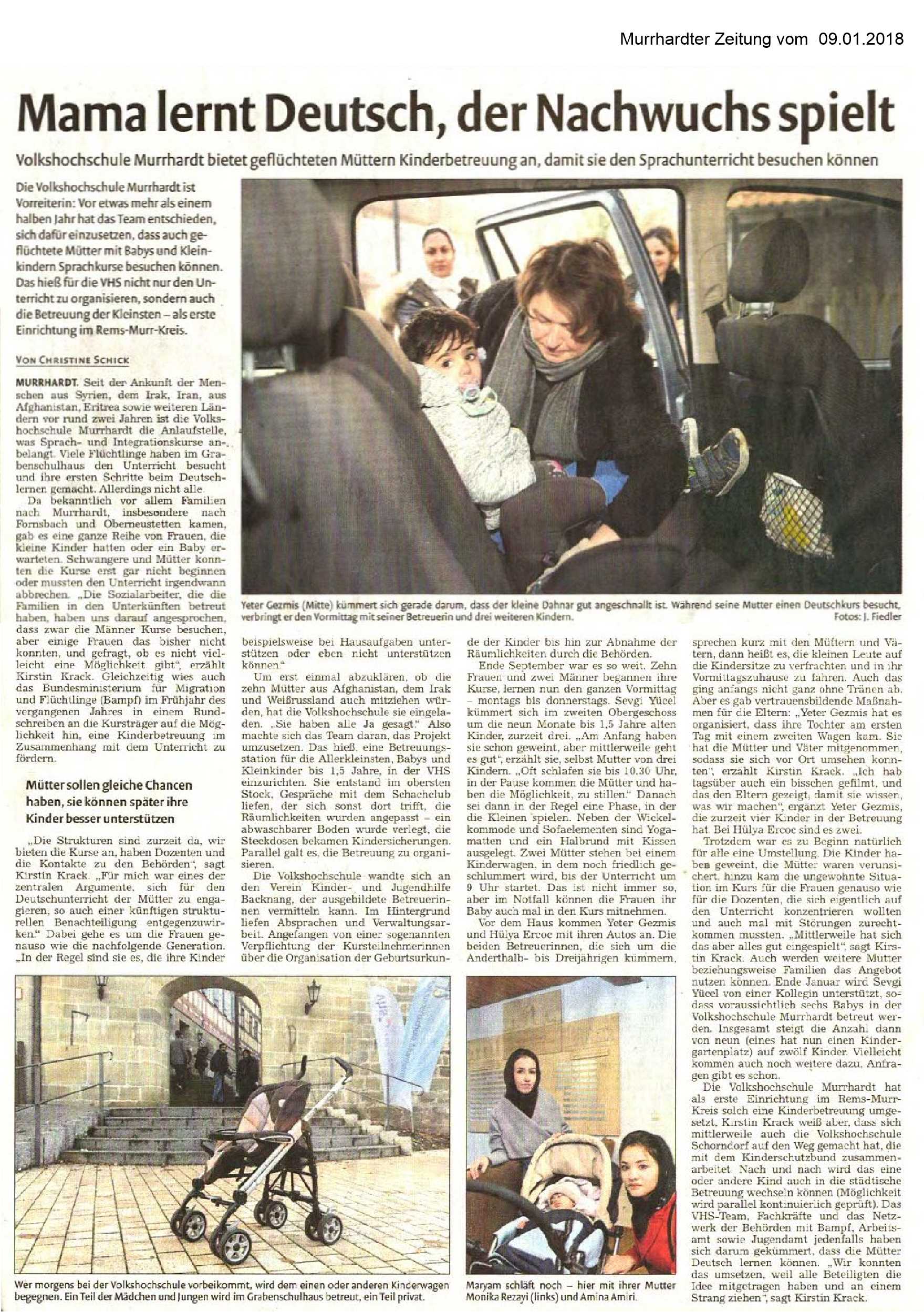 09. Januar 2018 - Murrhardter Zeitung - VHS - Mama lernt Deutsch, der Nachwuchs spielt