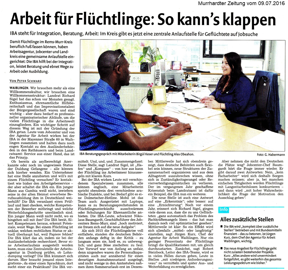 09. Juli 2016 - Murrhardter Zeitung - Agentur für Arbeit - Arbeit für Flüchtlinge: So kann´s klappen