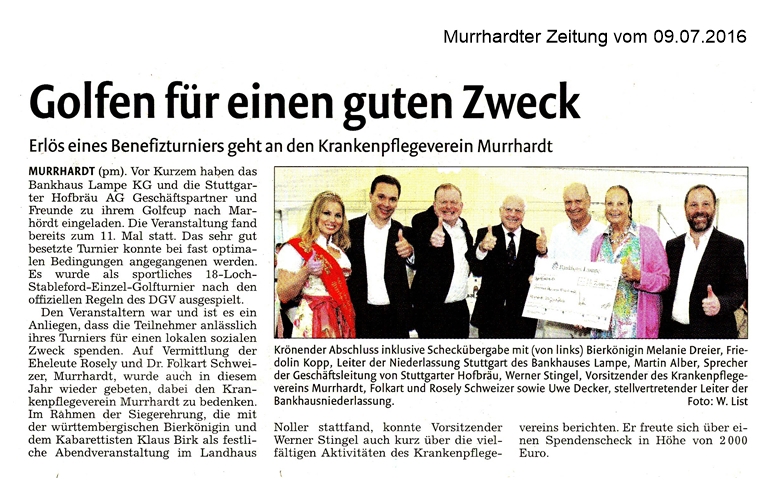 09. Juli 2016 - Murrhardter Zeitung - Golfclub Marhördt - Golfen für einen guten Zweck