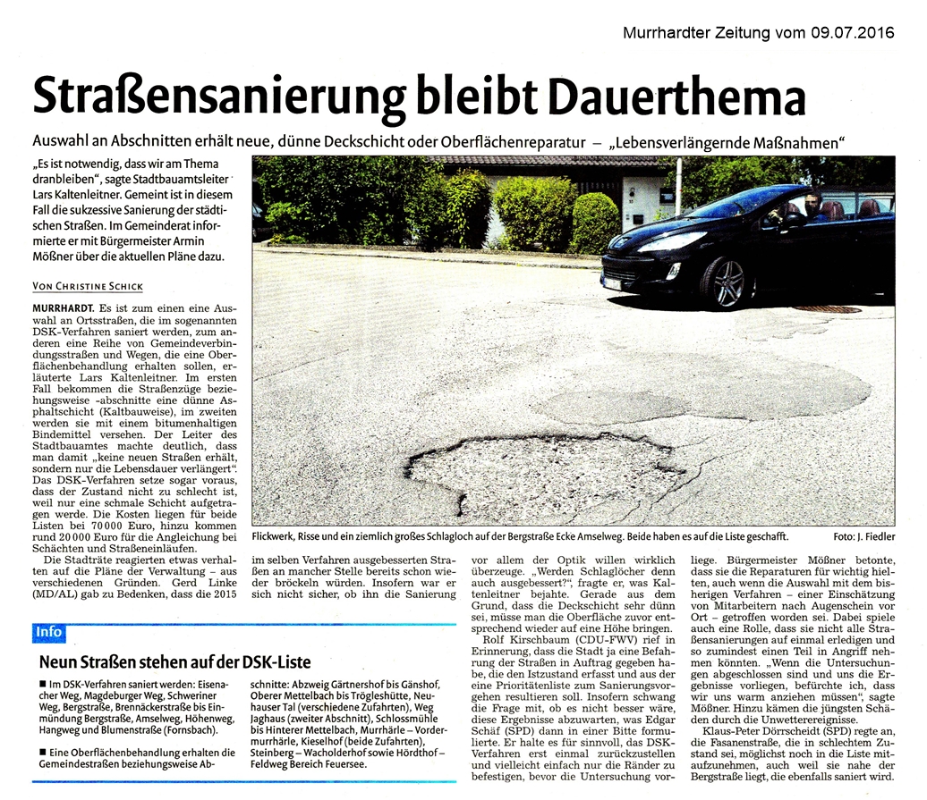 09. Juli 2016 - Murrhardter Zeitung - Stadt Murrhardt - Straßensanierung bleibt Dauerthema
