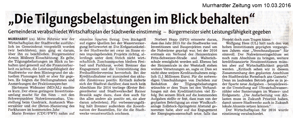 10. März 2016 - Murrhardter Zeitung - Stadtwerke - "Die Tilgungsbelastungen im Blick behalten"