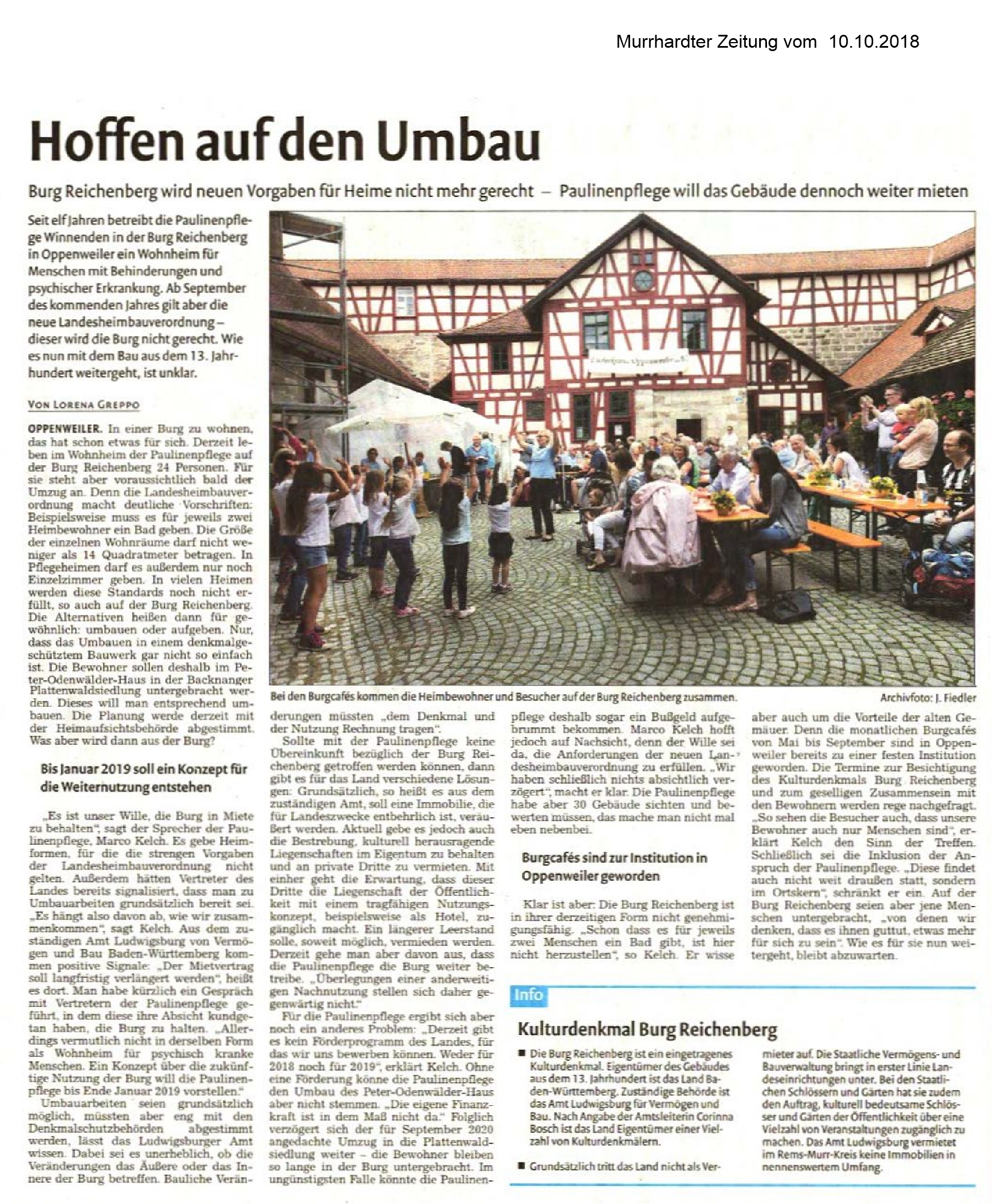 10. Oktober 2018 - Murrhardter Zeitung - Paulinenpflege - Hoffen auf den Umbau