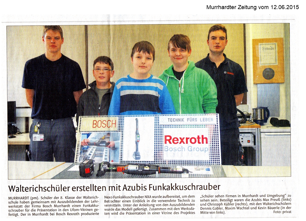 12. Juni 2015 - Murrhardter Zeitung - Walterichschüler erstellten mit Azubis Funkakkuschrauber