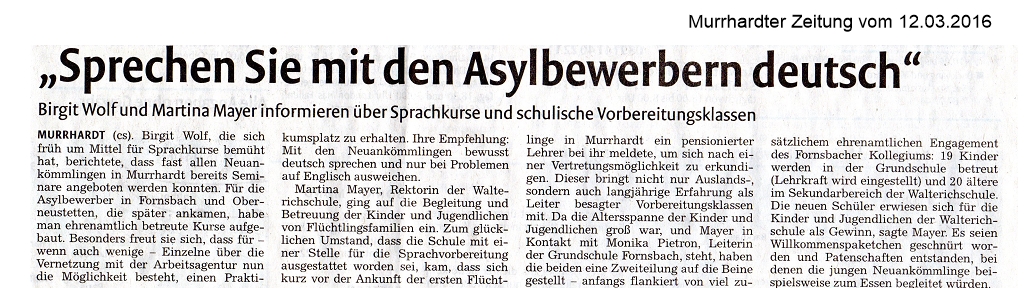 12. März 2016 - Murrhardter Zeitung - VHS - "Sprechen Sie mit den Asylbewerbern deutsch"