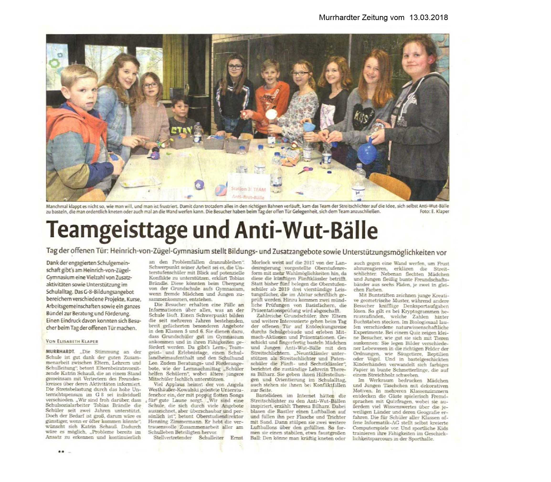 13. März 2018 - Murrhardter Zeitung - HvZG - Teamgeisttage und Anti-Wut-Bälle