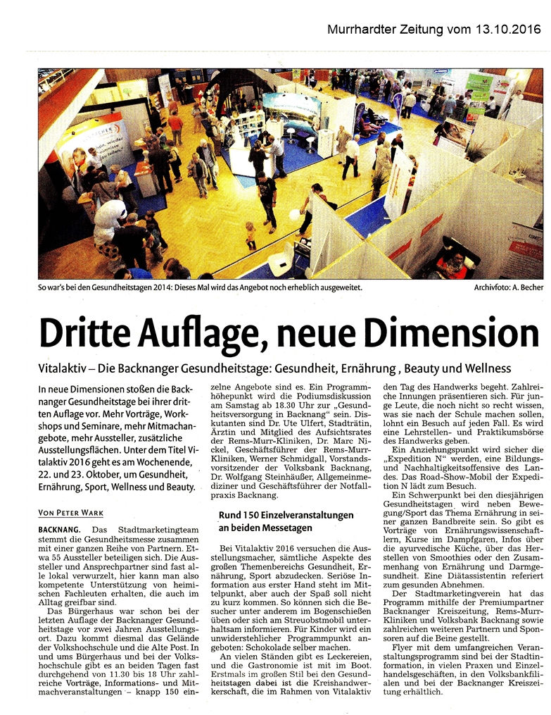 13. Oktober 2016 - Murrhardter Zeitung - Voba Backnang - Dritte Auflage, neue Dimensionen