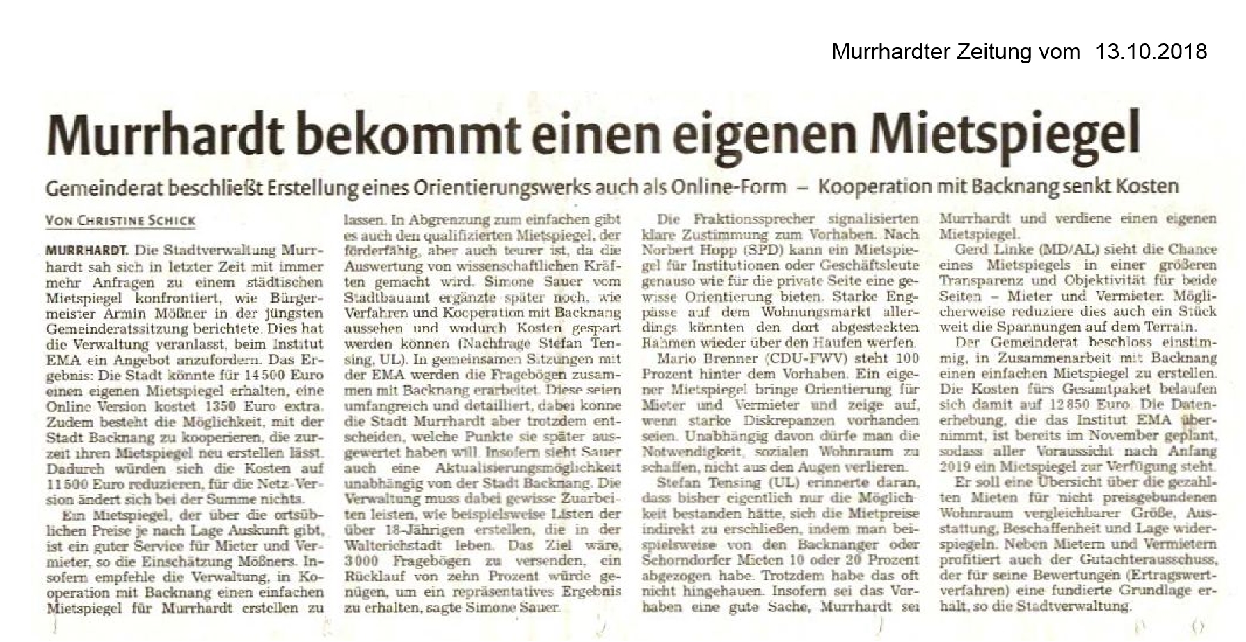 13. Oktober 2018 - Murrhardter Zeitung - Stadt Murrhardt - Murrhardt bekommt einen eigenen Mietspiegel