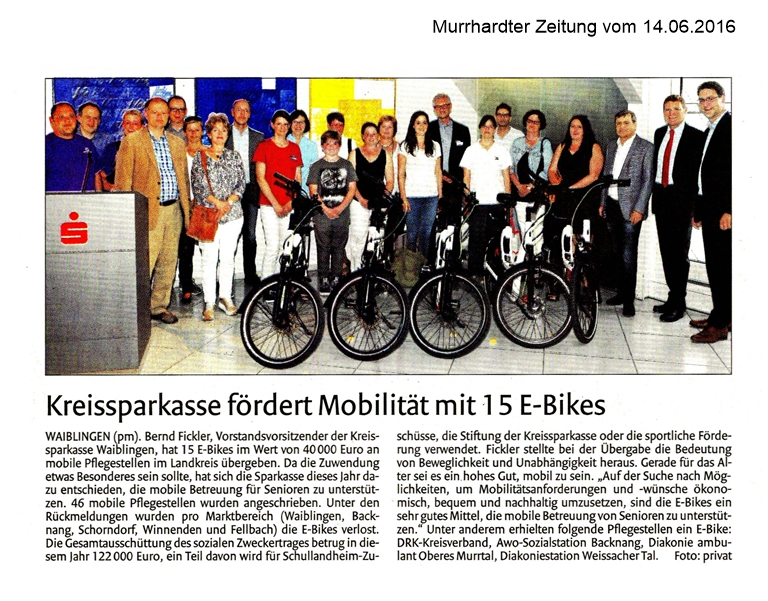 14. Juni 2016 - Murrhardter Zeitung - Kreissparkasse Waiblingen - Kreissparkasse fördert Mobilität mit 15 E-Bikes