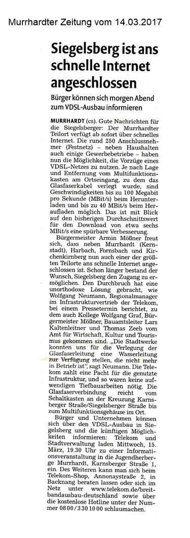 14. März 2017 - Murrhardter Zeitung - Stadt Murrhardt - Siegelsberg ist ans schnelle Internet angeschlossen