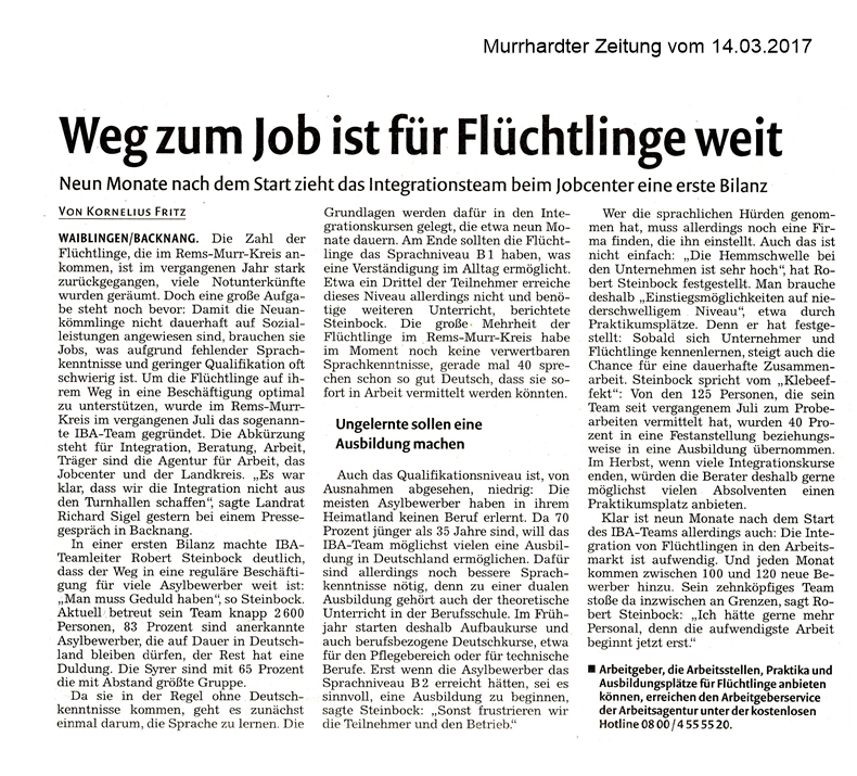 14. März 2017 - Murrhardter Zeitung - Stadt Murrhardt - Weg zum Job ist für Flüchtlinge weit