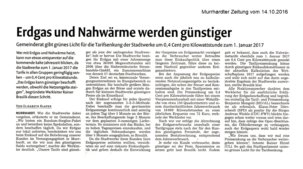14. Oktober 2016 - Murrhardter Zeitung - Stadtwerke Murrhardt - Erdgas und Nahwärme werden günstiger
