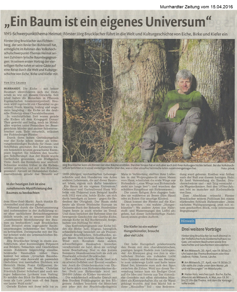 15. April 2016 - Murrhardter Zeitung - VHS - "Ein Baum ist ein eigenes Universum"