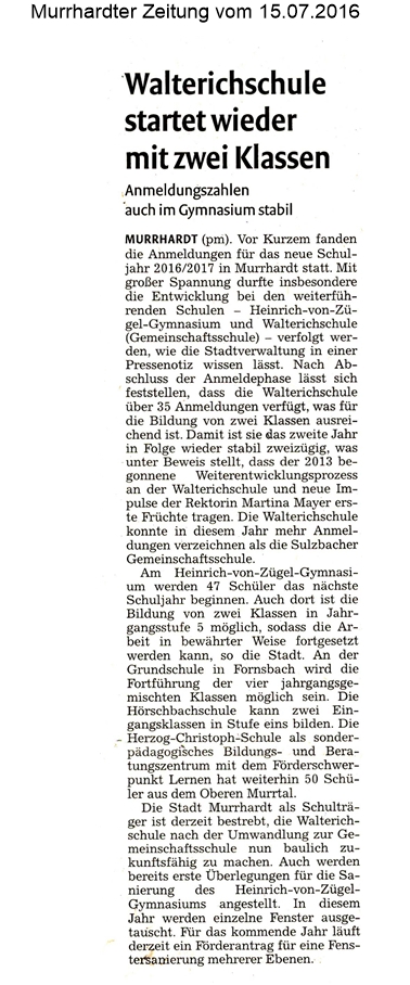 15. Juli 2016 - Murrhardter Zeitung - Walterichschule/HvZG - Walterichschule startet wieder