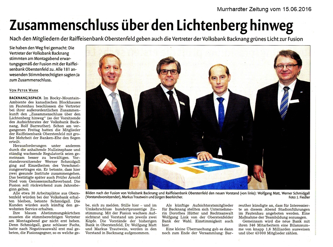 15. Juni 2016 - Murrhardter Zeitung - Volksbank Backnang - Zusammenschluss über den Lichtenberg hinweg