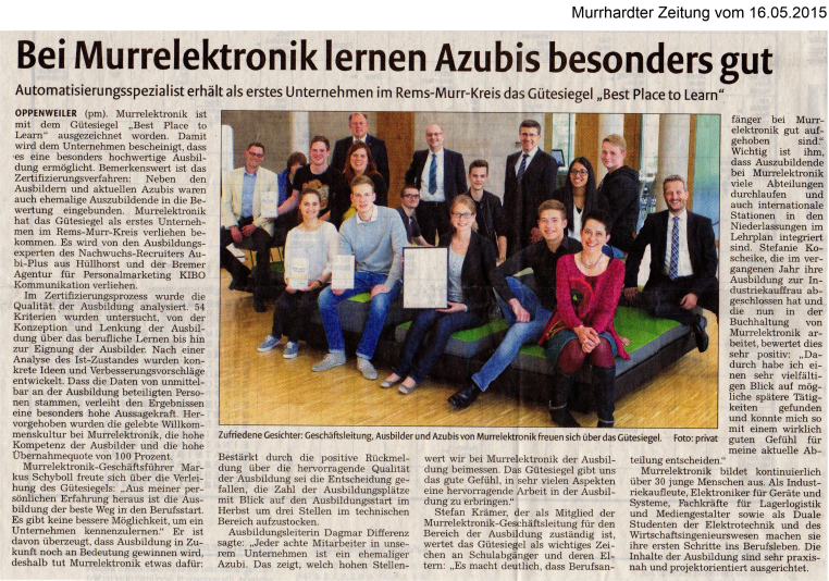 16. Mai 2015 - Murrhardter Zeitung - Bei Murrelektronik lernen Azubis besonders gut