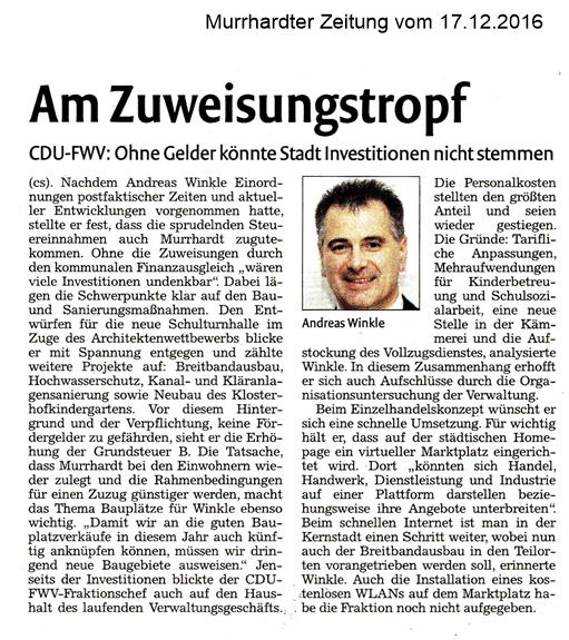 17. Dezember 2016 - Murrhardter Zeitung - Stadt Murrhardt - Am Zuweisungstropf