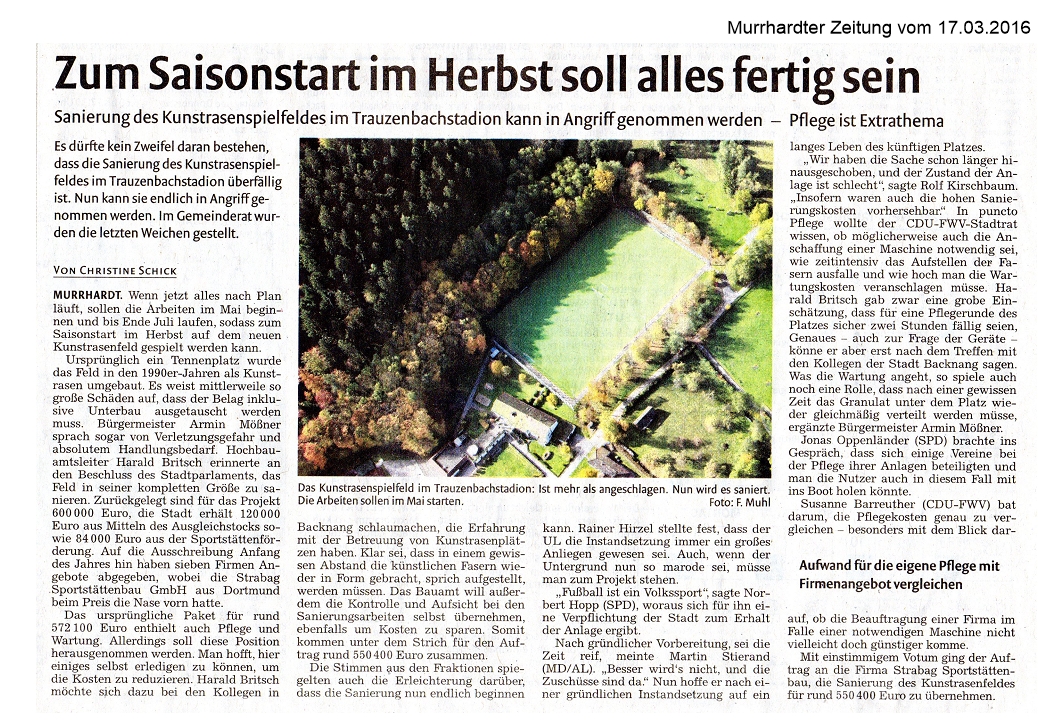 17. März 2016 - Murrhardter Zeitung - Stadt Murrhardt - Zum Saisonstart im Herbst soll alles fertig sein