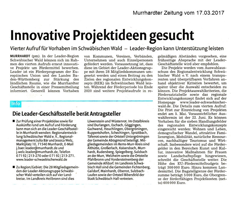 17. März 2017 - Murrhardter Zeitung - LEADER - Innovative Projektideen gesucht