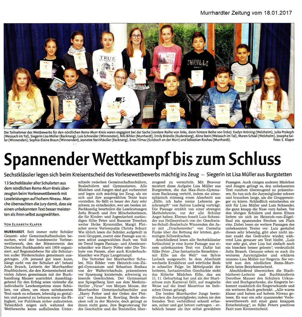 18. Januar 2017 - Murrhardter Zeitung - HvZG / Walterichschule - Spannender Wettkampf bis zum Schluss