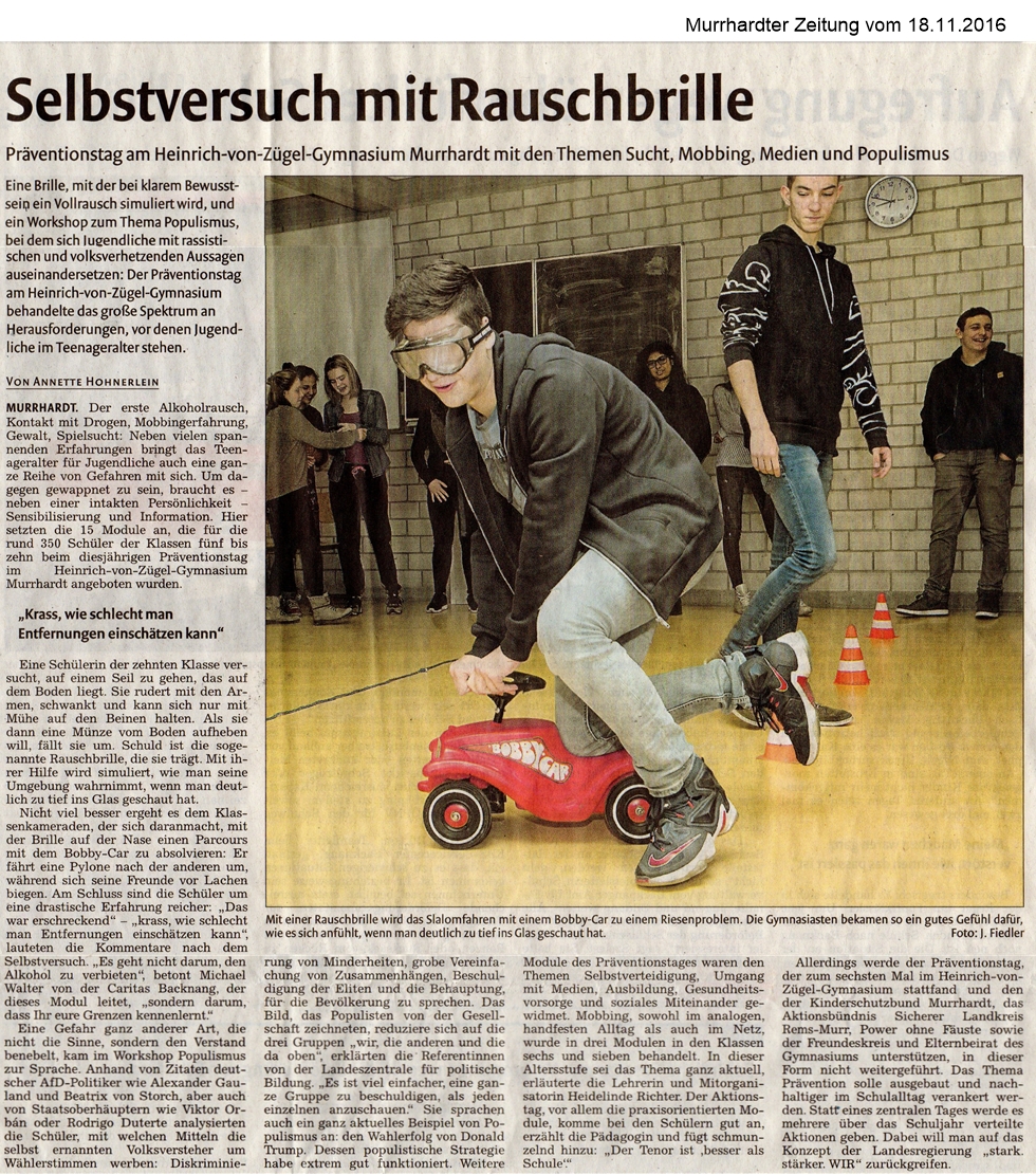 18. November 2016 - Murrhardter Zeitung - HvZG - Selbstversuch mit Rauschbrille