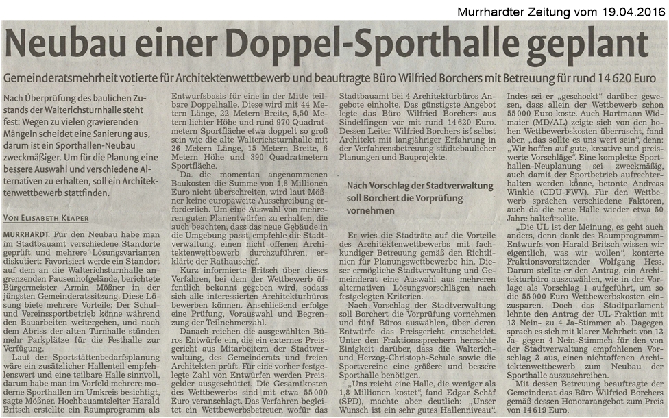 19. April 2016 - Murrhardter Zeitung - Walterichschule - Neubau einer Doppel-Sporthalle geplant