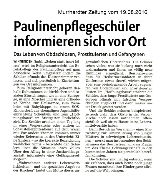 19. August 2016 - Murrhardter Zeitung - Paulinenpflege - Paulinenpflegeschüler informieren sich vor Ort
