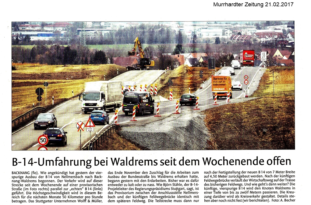 21. Februar 2017- Murrhardter Zeitung - B-14 - B-14-Umfahrung bei Waldrems seit dem Wochenende offen