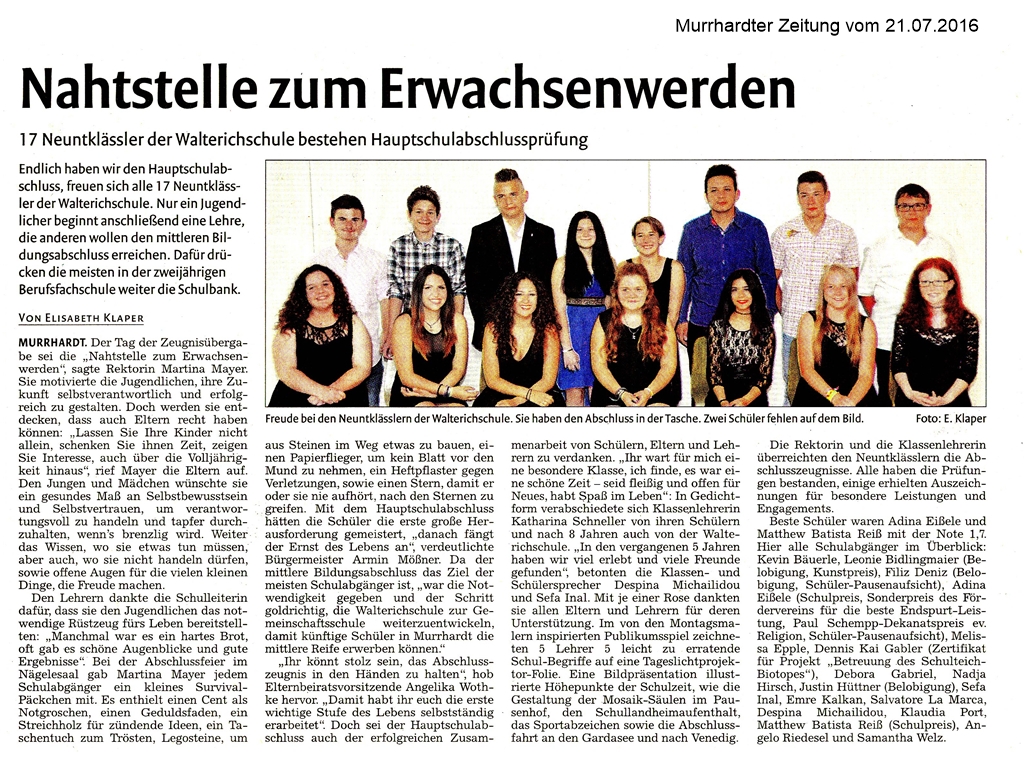 21. Juli 2016 - Murrhardter Zeitung - Walterichschule - Nahstelle zum Erwachsenwerden