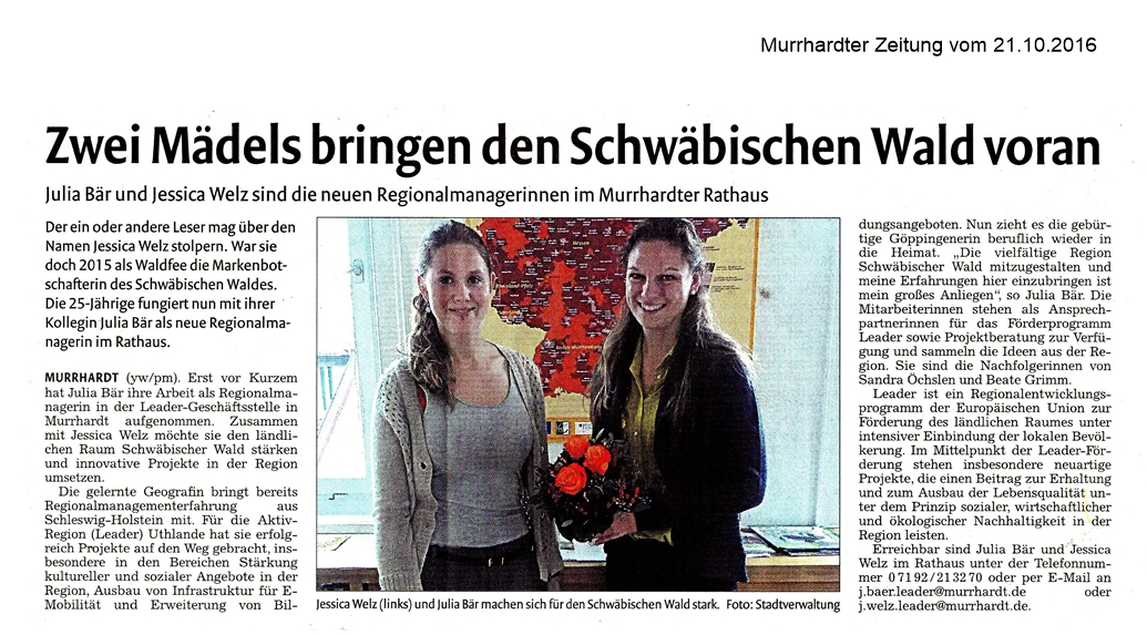 21. Oktober 2016 - Murrhardter Zeitung - Leader - Zwei Mädels bringen den Schwäbischen Wald voran