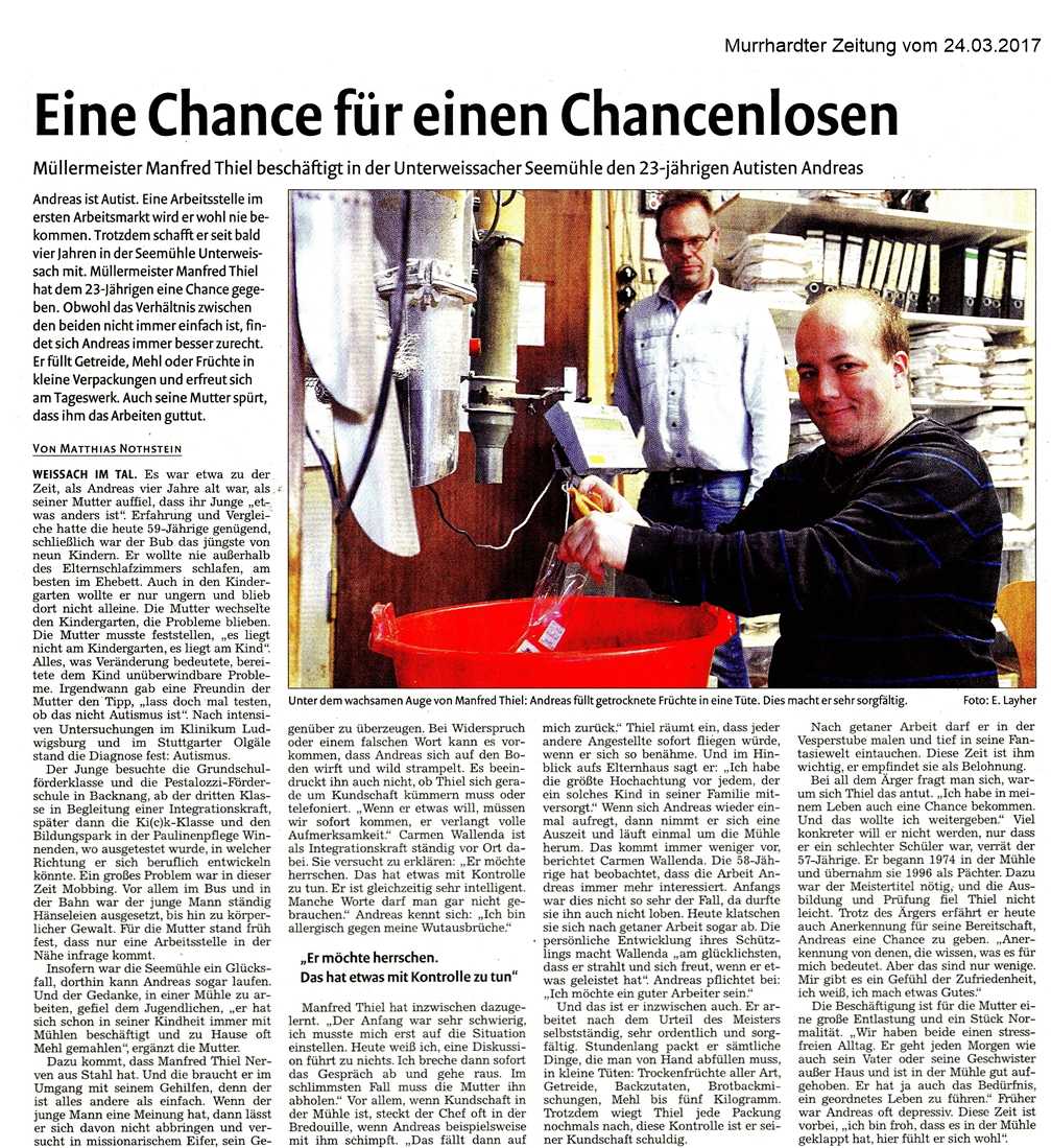 24. März 2017 - Murrhardter Zeitung - Paulinenpflege Winnenden/Unterweissacher Seemühle - Eine Chance für einen Chancenlosen