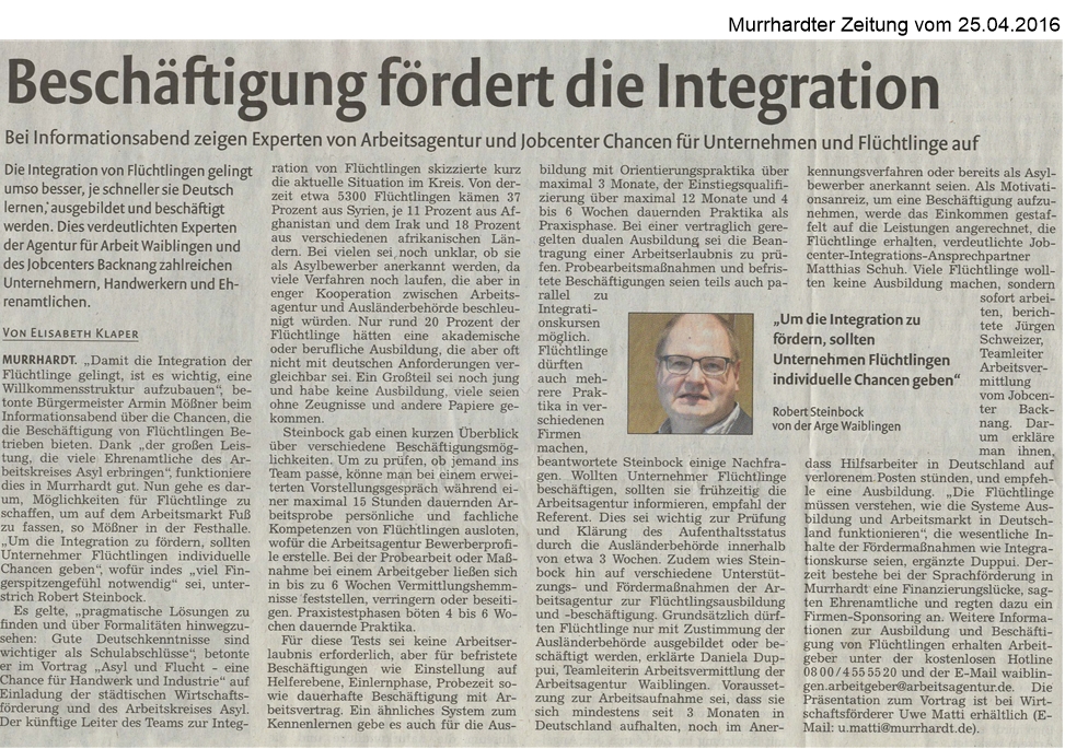 25. April 2016 - Murrhardter Zeitung - Stadt Murrhardt - Beschäftigung fördert die Integration