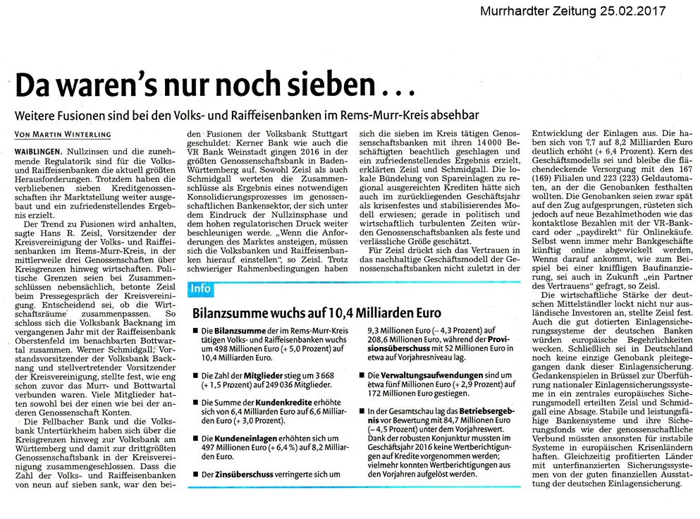 25. Februar 2017 - Murrhardter Zeitung - Volks- und Raiffeisenbanken - Da waren´s nur noch sieben...