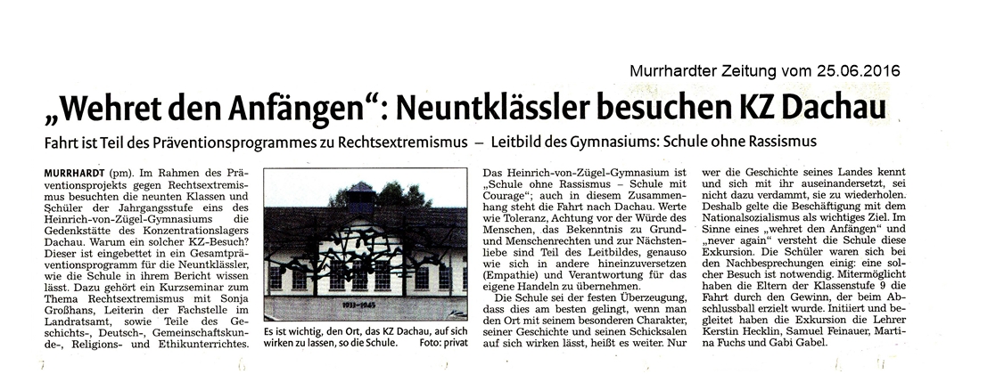 25. Juni 2016 - Murrhrardter Zeitung - HvZG - "Wehret den Anfängen": Neuntklässler besuchen KZ Dachau