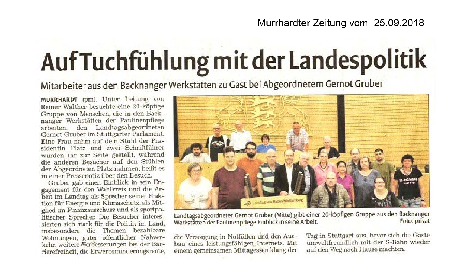 25. September 2018 - Murrhardter Zeitung - Backnanger Werkstätten - Auf Tuchfühlung mit der Landespolitik