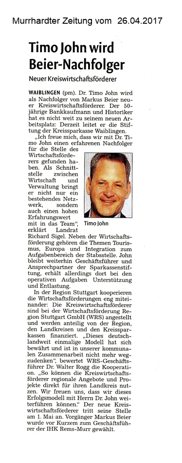 26. April 2017 - Murrhardter Zeitung - WRS - Timo John wird Beier-Nachfolger