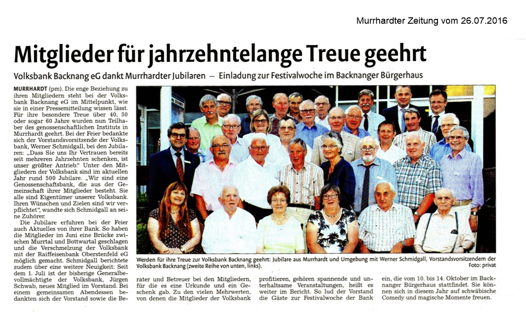 26. Juli 2016 - Murrhardter Zeitung - Volksbank Backnang - Mitglieder für jahrzentelange Treue geehrt