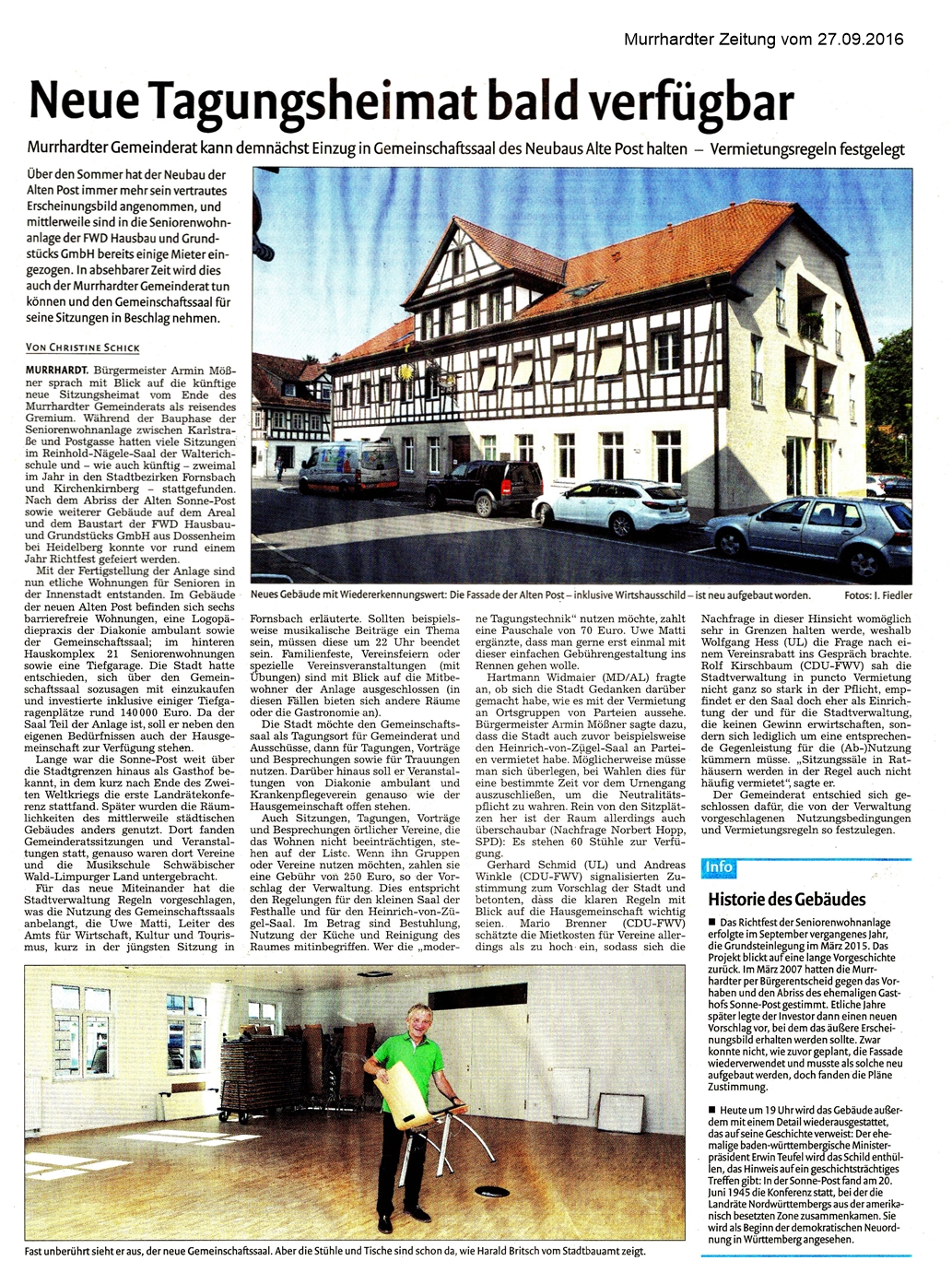 27. September 2016 - Murrhardter Zeitung - Stadt Murrhardt - Neue Tagungsheimar bald verfügbar